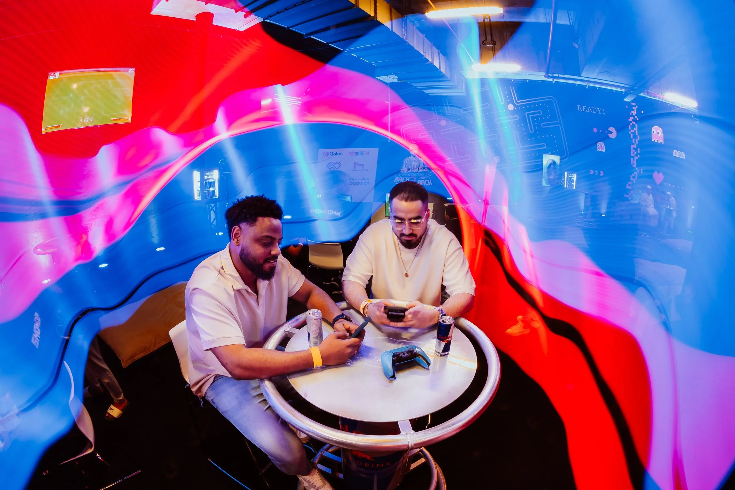 Two men sitting at a round table in a colorful, neon-lit arcade, playing on their smartphones with gaming controllers and drinks on the table.