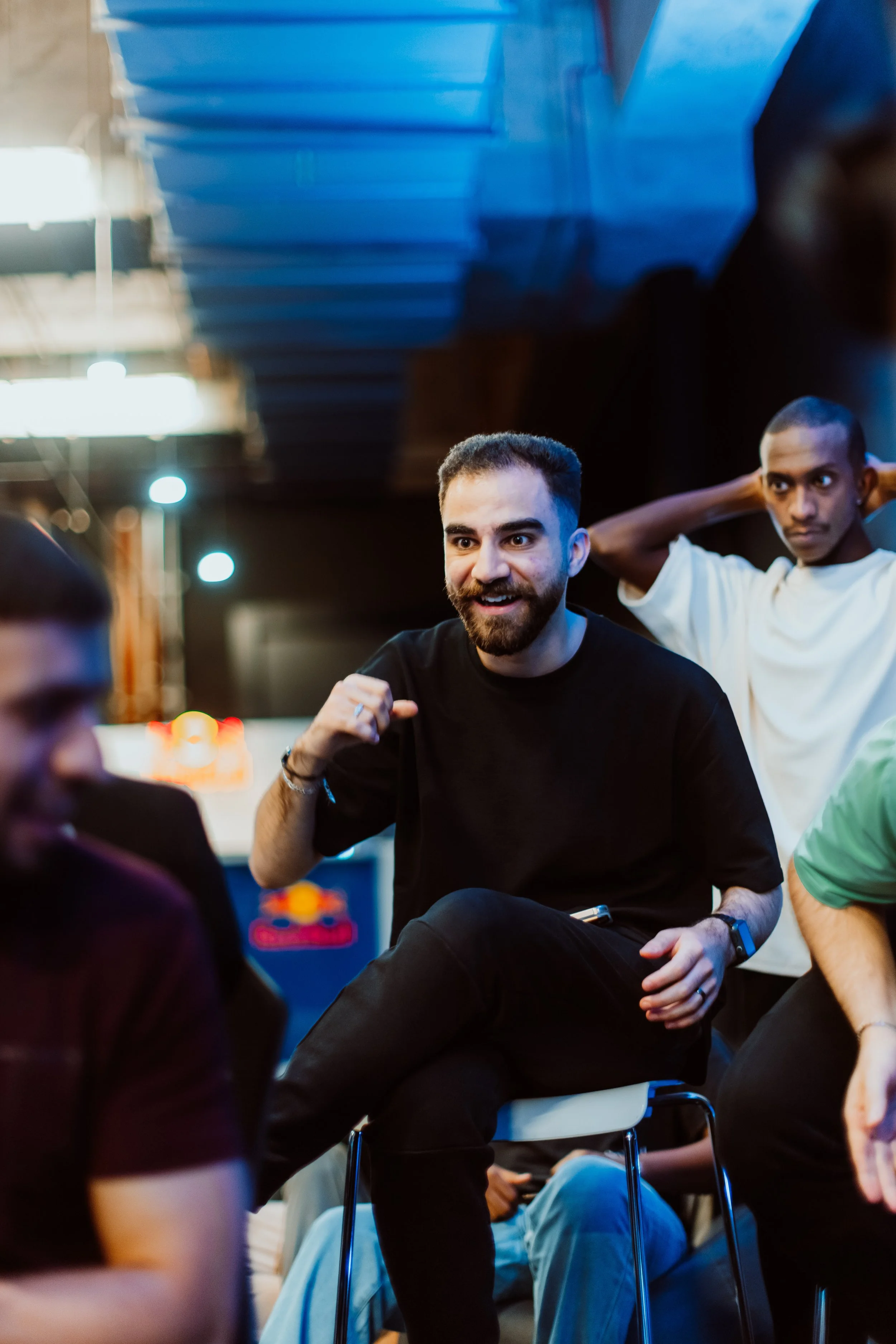 A group of people gathered indoors, with one man in a black shirt sitting on a chair, smiling and making a fist gesture, others around him are engaged in conversation and appear to be having a good time.