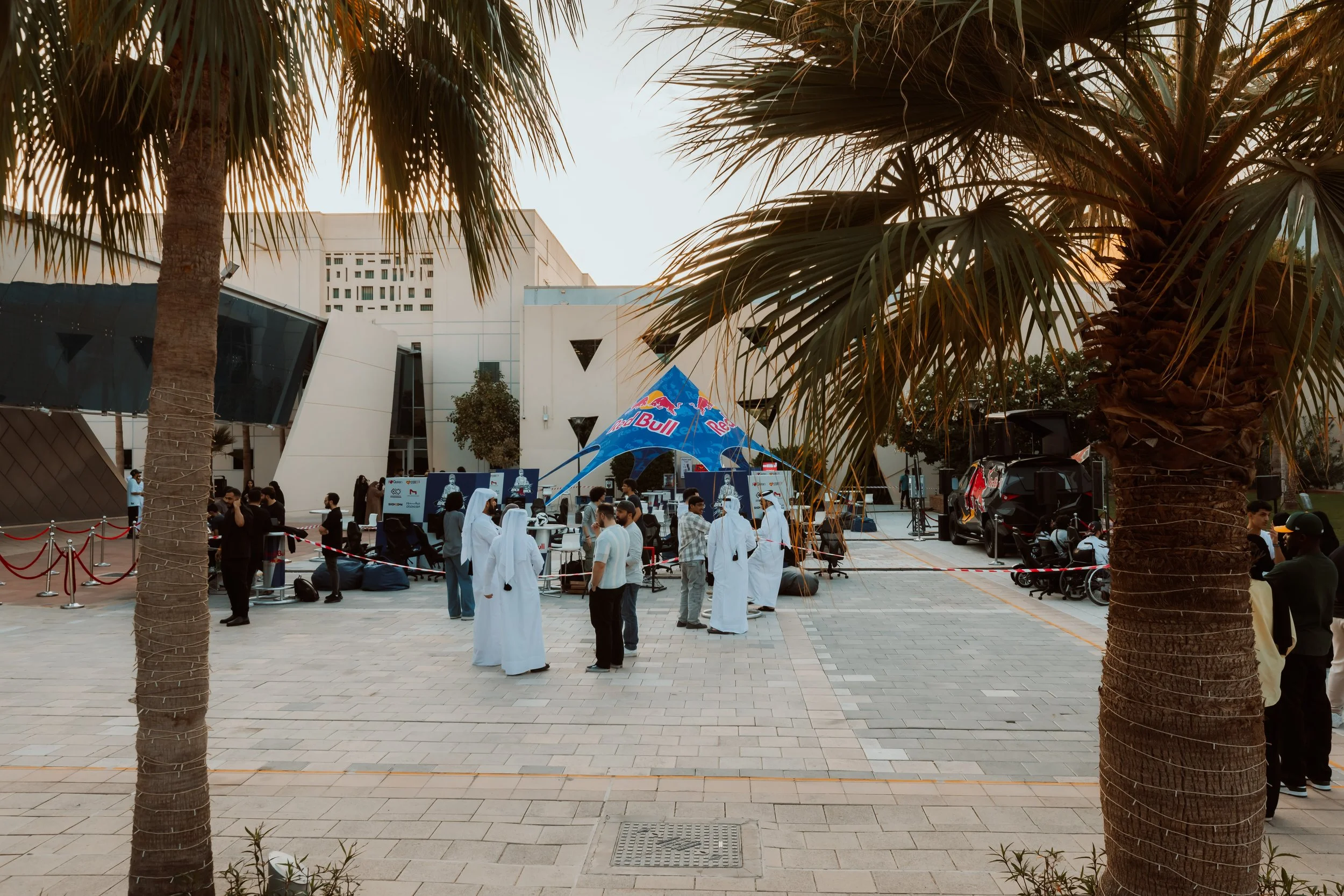 Outdoor event space with a Red Bull tent, palm trees, and groups of people, some dressed in traditional Middle Eastern clothing, near modern buildings at sunset.