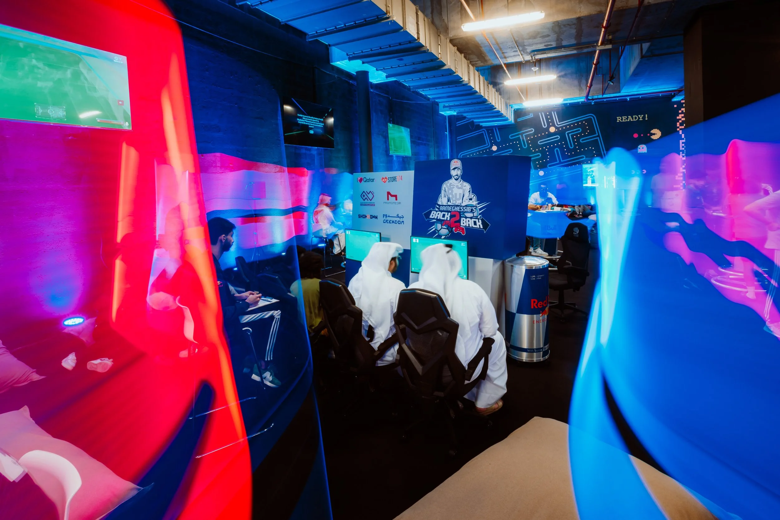 People at a gaming event, with some seated at computer stations, two dressed in traditional Qatari attire, viewing screens. The background features a large poster of a man with a soccer ball and gaming controllers, surrounded by signs for gaming bran