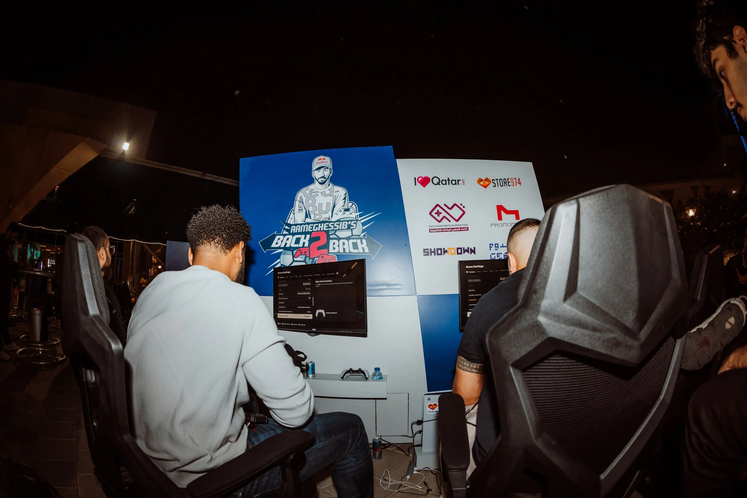 People playing a video game at a Red Bull gaming event called 'AmeGhesib's Back 2 Back', with monitors and branded banners in the background.